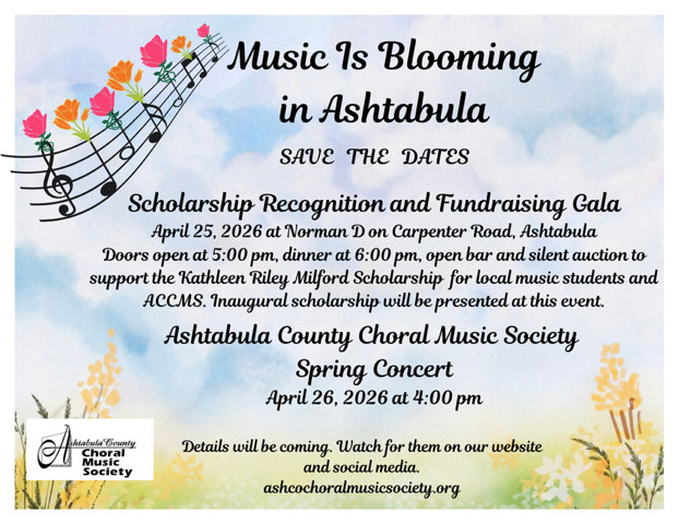 “Music is Blooming in Ashtabula” is the theme for the Ashtabula County Choral Music Society Gala Dinner and Silent Auction on April 25th, 2026, at the Norman-D Banquet Center. The Gala will include the presentation to the winner(s) of the Kathleen R. Milford Scholarship, awarded for vocal talent to pursue further vocal/choral education. ACCMS is requesting Northeast Ohio businesses and Individuals to donate goods and services or dollars towards a Silent Auction to support ACCMS and the Scholarship Fund. Contributors will be listed on the item and in the program brochure.